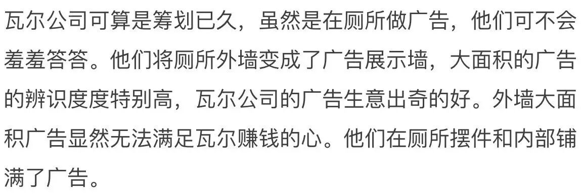 瓦尔公司花式打广告,并不会破坏公厕的整体美感。贴满小广告的公厕会让人反感,而让公厕更美观的瓦尔公司则非常受欢迎。
