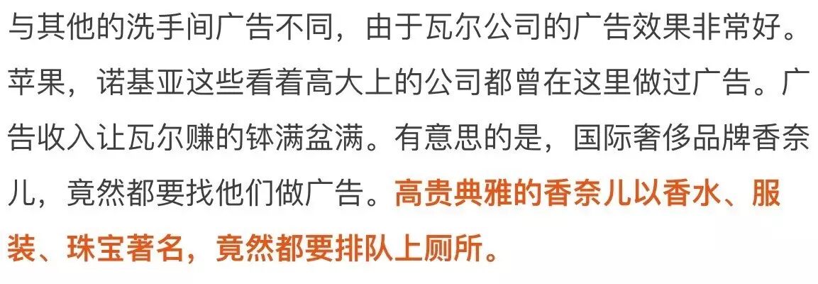 厕所广告又有多少利润呢?城市里很早就有洗手间广告了,这种广告很少有人留意,广告费很低。大家潜意识认为靠卫生间广告赚的钱对于投入来说简直是微乎其微,老瓦尔可能失策了。