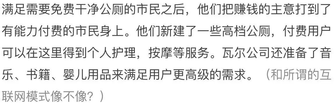 厕所里还能干什么?厕所周围还有什么?在厕所里还可以打电话呀,上网呀,他们与运营商合作,并从运营商那里得到一些提成。