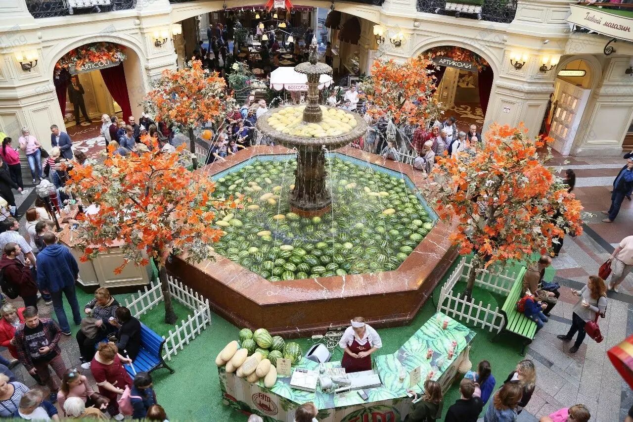 所以最吸引我的就是中间一楼的喷泉了,它竟然放着满泉的西瓜和哈密瓜。