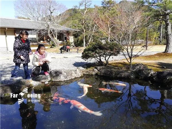 风景很美,有很多鱼池,里面也有许许多多的小鱼。我进去的时候要先脱掉鞋子,里面的点心回味无穷。我出来的时候买了两包鱼食,一包给田田姐姐,一包给我自己,一把食物扔下去鱼就开始猛吃。