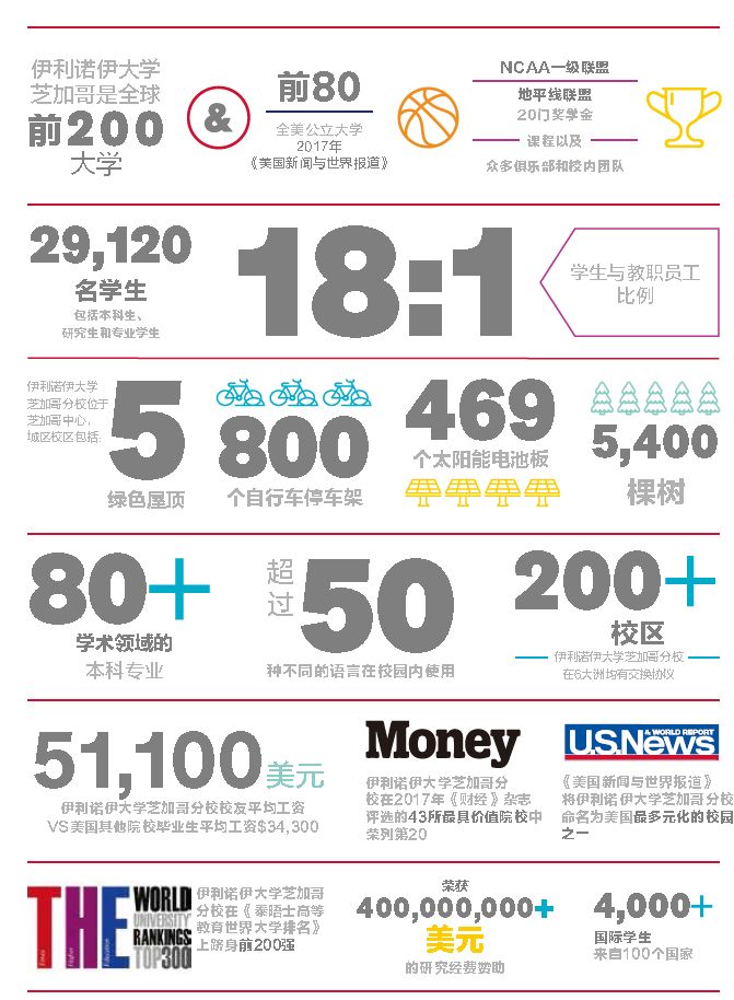 伊利诺伊大学芝加哥分校(UIC)是芝加哥市中心主要的研究型大学,教育质量堪称世界一流。伊利诺伊大学芝加哥分校共有15个学院,其中包括全国最大的医学院,每年研究花费超过三亿三千二百万美元。学生总人数中本科生约占65%,研究生和专业学院学生占35%,被认为是美国多样化程度最高的大学之一。
