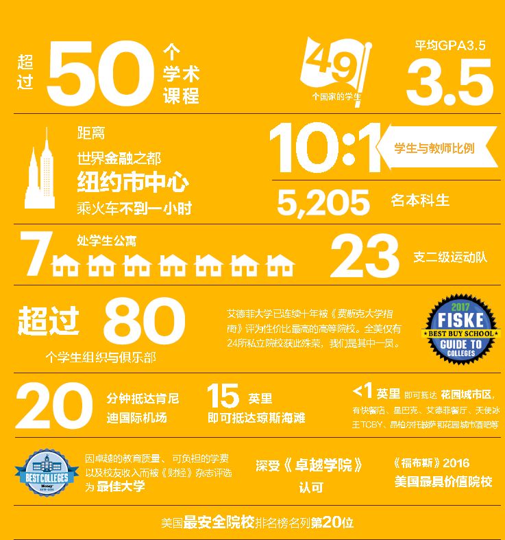 艾德菲大学1896年建校,坐落于闻名遐尔的纽约长岛,距离纽约市仅1小时的地铁路程,是长岛第一所高等院校。学校可授予各种学士、硕士及博士学位,本科及硕士专业提供包括专业涉及人文、科学、人性学、商学、教育、护理和保健、社会福利、临床心理学等课程。学校的中央图书馆拥有超过170万册完全计算机化的书籍、微缩影片,并可透过网络存取世界其它的图书馆。艾德菲大学是纽约长岛上最古老的高等学习机构。2005年,普林斯顿评论把艾德菲大学评为美国东北部最好的大学之一。艾德菲商学院获AACSB认证!