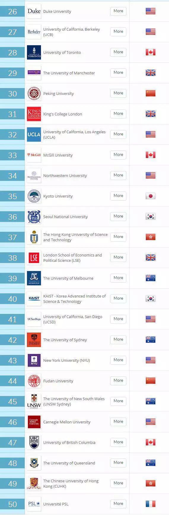 中国排名最高的清华大学位列第17位,首次挺进前20。