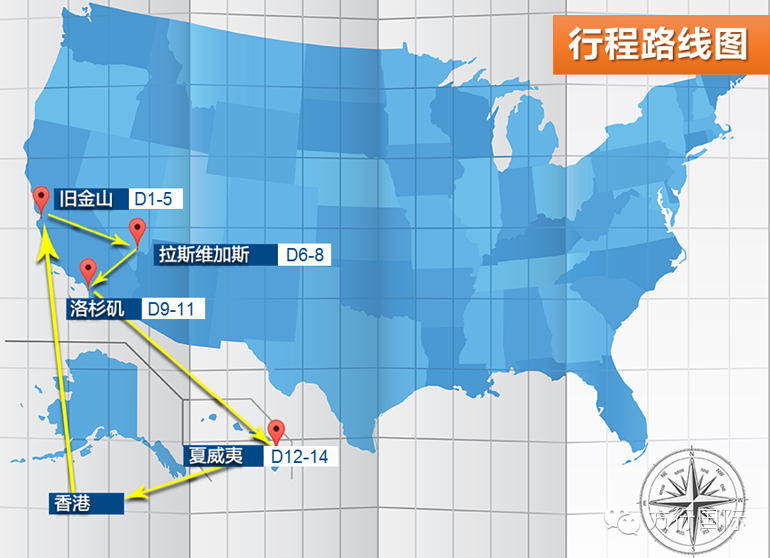 D4 | 上午:考察安捷伦科技有限公司。 下午:培训讲座:传授:提升产品售价的秘诀。 | 旧金山 |