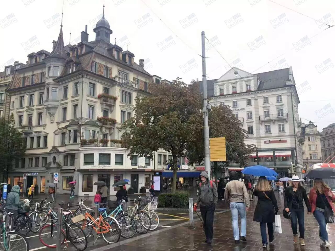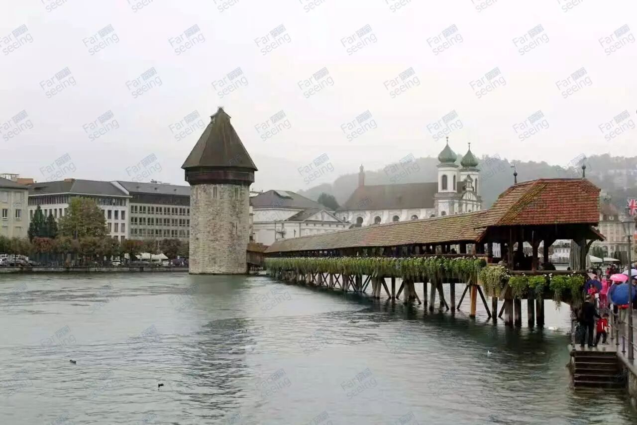 我们稍后来到了雨中的卢塞恩。卢塞恩是座文化名城,艺术家在此得到了不尽的灵感,有着各种中世纪雕像与壁画。古朴的卡贝尔桥,跨越罗伊斯河。静谧的卢塞恩湖,与两岸中世纪欧洲建筑、现代建筑相映衬。